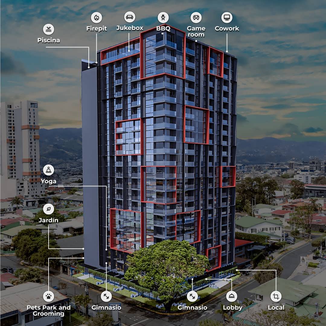 Una Torre que se diferencia icónicamente de los edificios altos en condominio residencial de Costa Rica. Un inigualable proyecto de la inmobiliaria CITIZEN INMOBILIARIA convertido en un gran símbolo de fuego, madera, roca volcánica y más; en la céntrica grandiosa zona de BARRIO ESCALANTE.